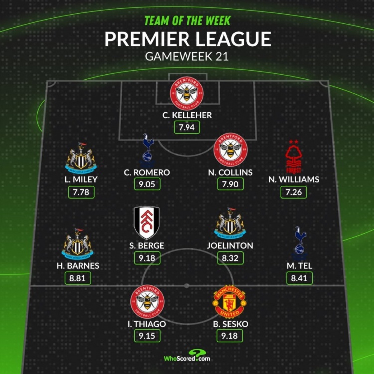 1月9日讯 英超第21轮已经战罢,whoscored也统计了本轮英超评分最佳阵容,纽卡斯尔、布伦特福德各3将入围。